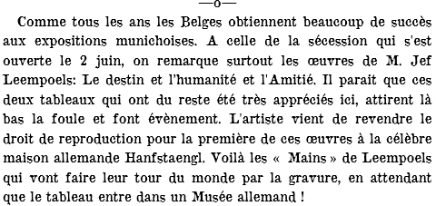 Geen wonder dat ze Jef Leempoels kennen in Duitsland. De "Große Berliner Kunstausstellung" en de "Münchener Secession" gaan bijna gelijktijdig van start. Jef Leempoels heeft voldoende geschilderd en kan het zich veroorloven om drie werken af te vaardigen naar elk van beide evenementen.