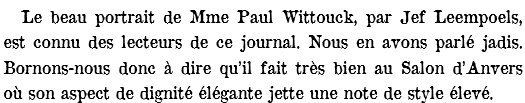 Naast het portret van Mevrouw Wittouck blijkt ook nog het atypische, ronde tableau met de titel “le Lever” in Antwerpen aanwezig te zijn. La Fédération becommentarieert de salon in verschillende afleveringen en heeft het kort over dit werk in deel V.