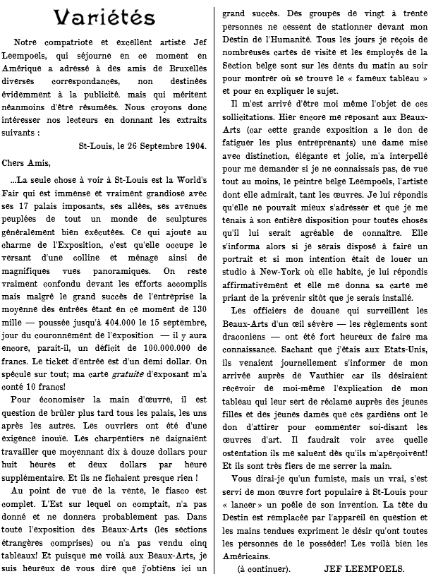 La Fédération gaat niet verder in op waar Leempoels naartoe gaat, maar wie een paar dagen toevallig de St Louis Dispatch in handen had, kon raden waar hij zich de volgende tijd zou ophouden. Onder de bizarre kop “Blue and Cerise Pigs on Canvas” gaat het eerst over werk van twee Franse schilders, Paul Vayson (de varkens) en François Marie Firmin-Girard (een marktscène). En dan gaat het plots over twee Belgische inzendingen, een stukje over “l’Araignée” van de Luikse kunstenares Marguerite Radoux gaat naadloos over in “Destiny and Humanity” van Leempoels.